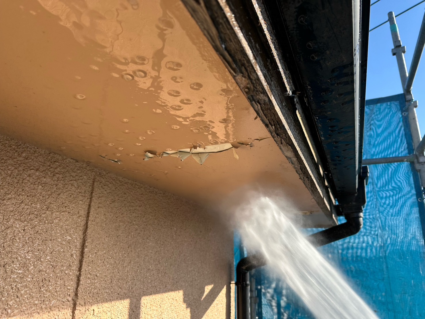 軒天井と破風板は塗膜が剥がれていたため、症状が広がらないように水圧を弱めて洗浄しました。